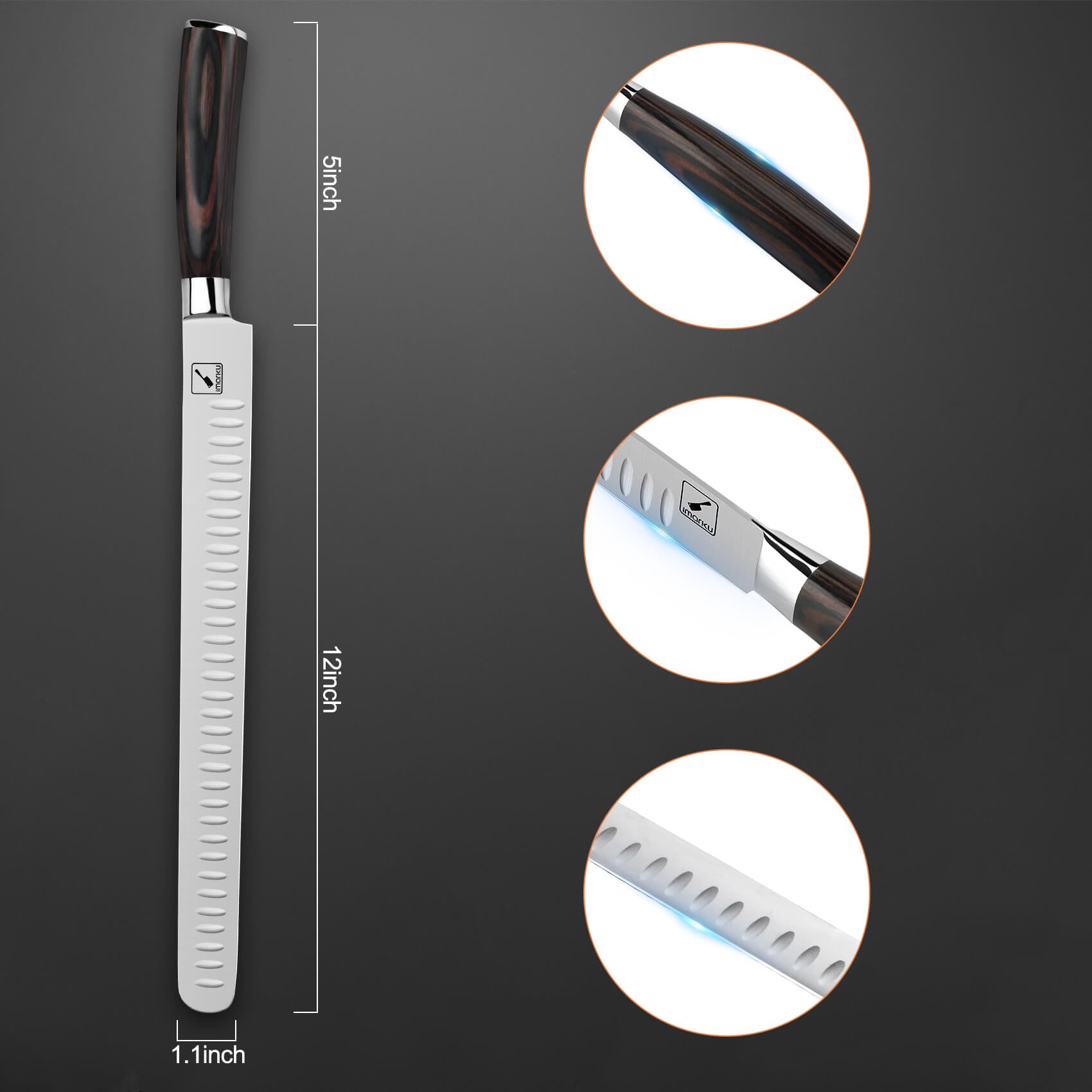 Imarku is a brand that specializes in manufacturing high-quality kitchen knives and cutlery for home and professional use. This 12-inch slicing carving knife boasts a carbon steel blade with a comfortable non-slip handle to give you the best slicing experience every time you use it.