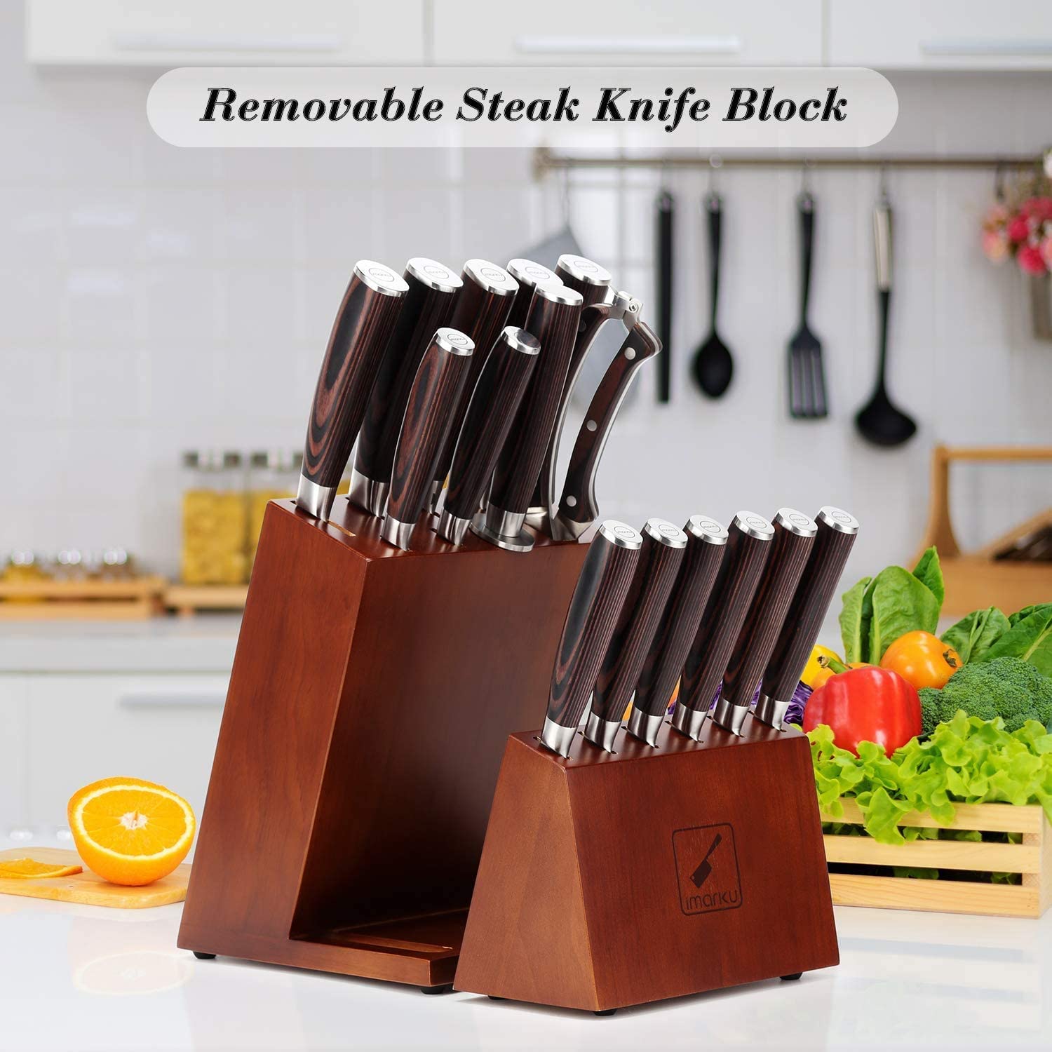 The individual knives are all made to different specifications, giving you the best tool for each specialized task. Despite their unique designs, beautiful matching handles make this an incredible display piece and ensure that your hands stay secure and comfortable as you cook. All of the knives feature the same no-nonsense iMarku engineering that delivers excellent performance without needlessly wasting your budget.