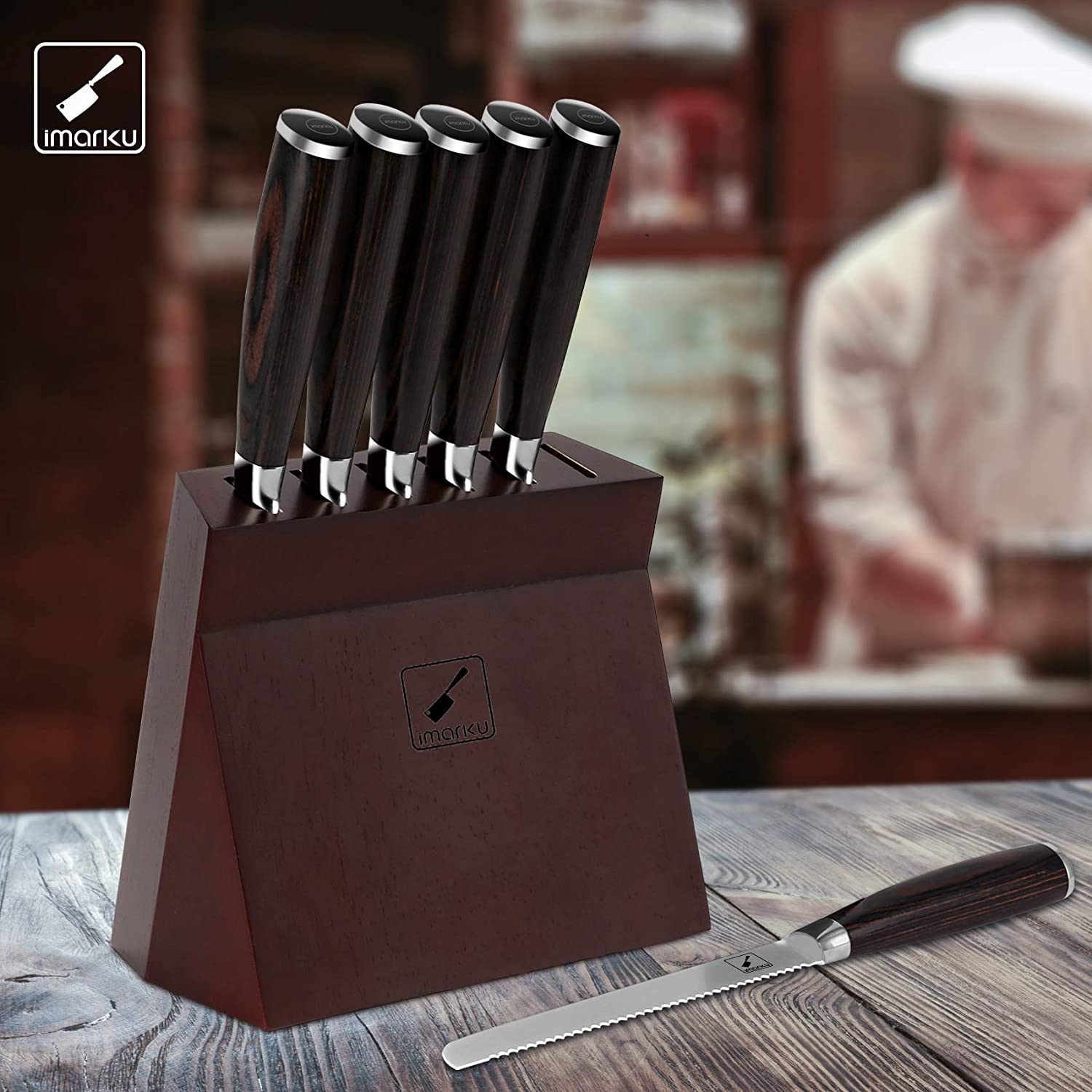 If you're looking to pick up more than one kitchen knife at once, knife blocks like this iMarku option here deliver brilliant value. Not only do you get a great deal on the knives themselves, but you also get a stylish wooden block that serves as a great accent to your kitchen while displaying your elegant new knives.