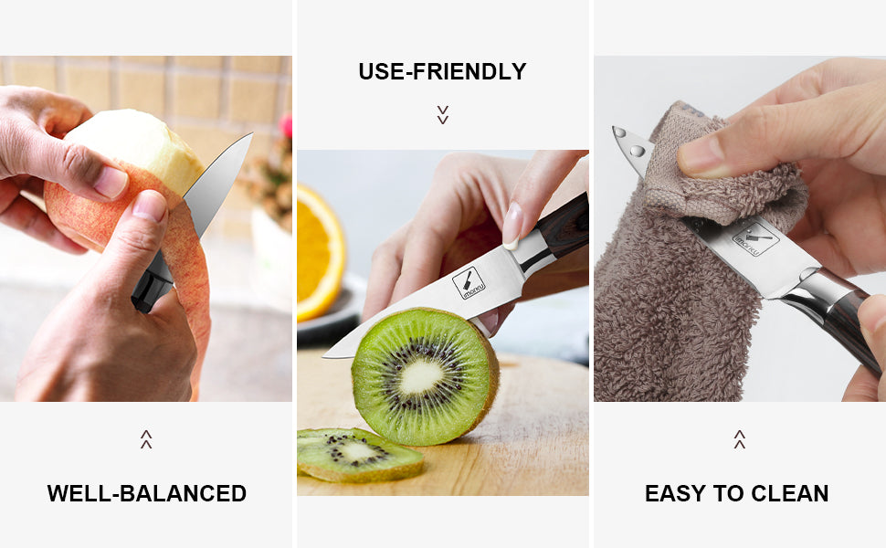 Due to their small size, the paring knives can fit in your hands, which plays a vital role in enhancing different kitchen cutting tasks or techniques. You can use different cutting methods or grips for your meal preparation needs. Additionally, it allows you to achieve a standard slicing on your cutting board. Most individuals use the knife to cut or slice different items on the board by directly taking the blades towards them, like peeling an apple.