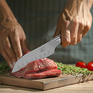 The Santoku knife features a rounded tip and a straighter blade profile, allowing for quick, downward cuts using the entire width of the blade. The 8 independent hollow grooves prevent ingredients from sticking, enabling you to prepare meat, vegetables, or fish with utmost precision. The Santoku is indispensable in both restaurant and home kitchens."