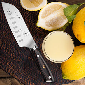 This Santoku knife blade has undergone "laser light" technology to form 8 special grooves on the blade to prevent food from sticking to the blade