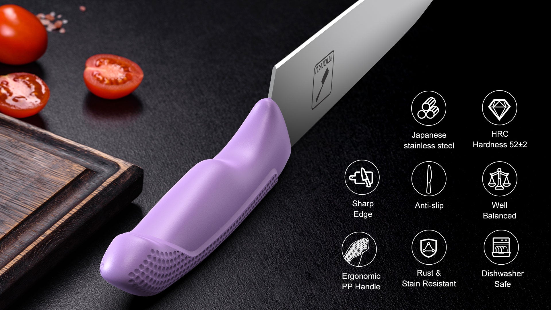 The ergonomic PP handles are non-slip and well-balanced, reducing hand fatigue and improving control. Combined with precision-forged stainless steel blades, this knife set allows beginners to cut safely and accurately.