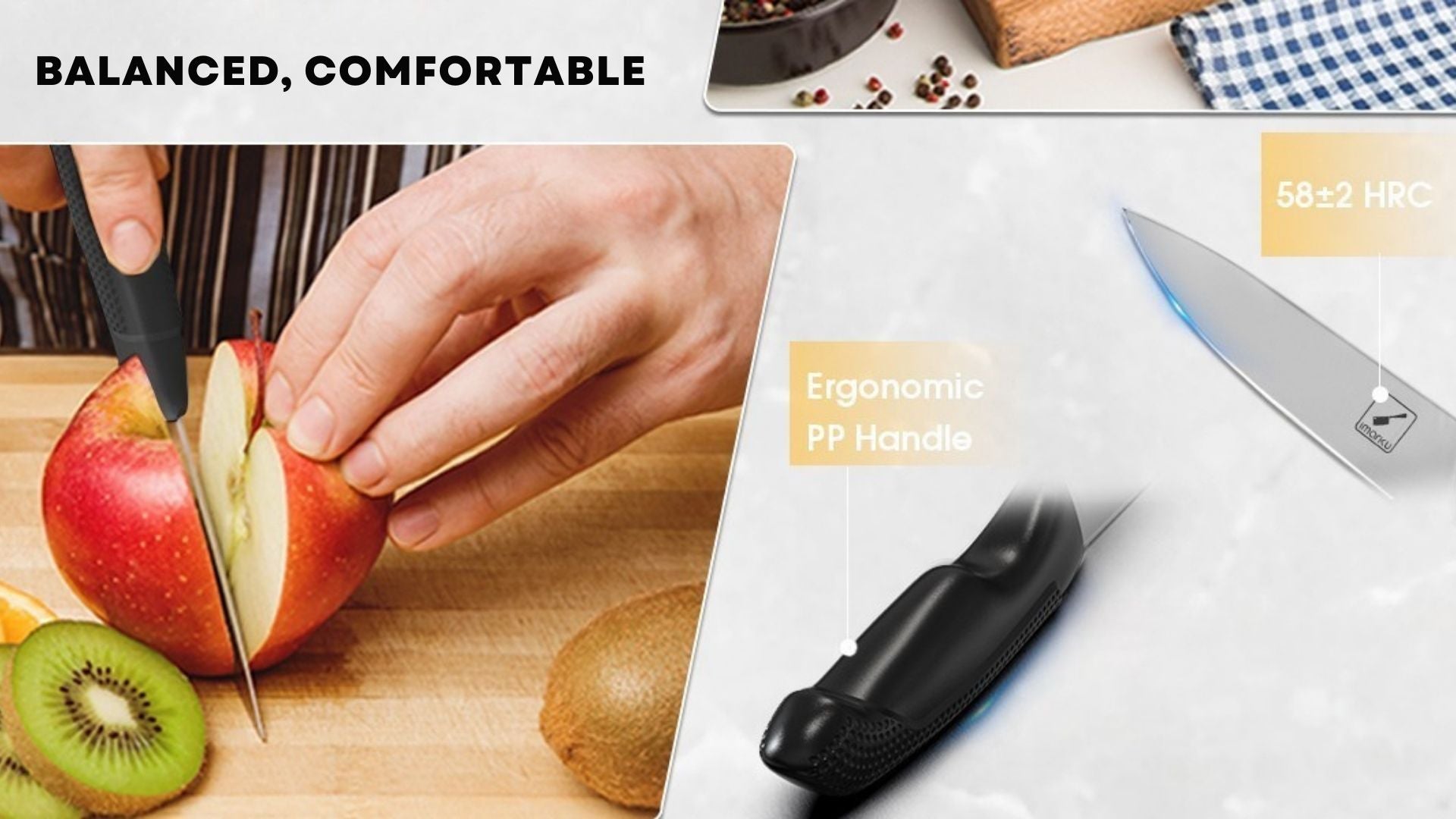 Designed with durable PP ergonomic knife handles, each knife offers a non-slip, well-balanced grip that improves control and comfort. The ergonomic handle shape reduces hand fatigue during extended food preparation and daily kitchen tasks.