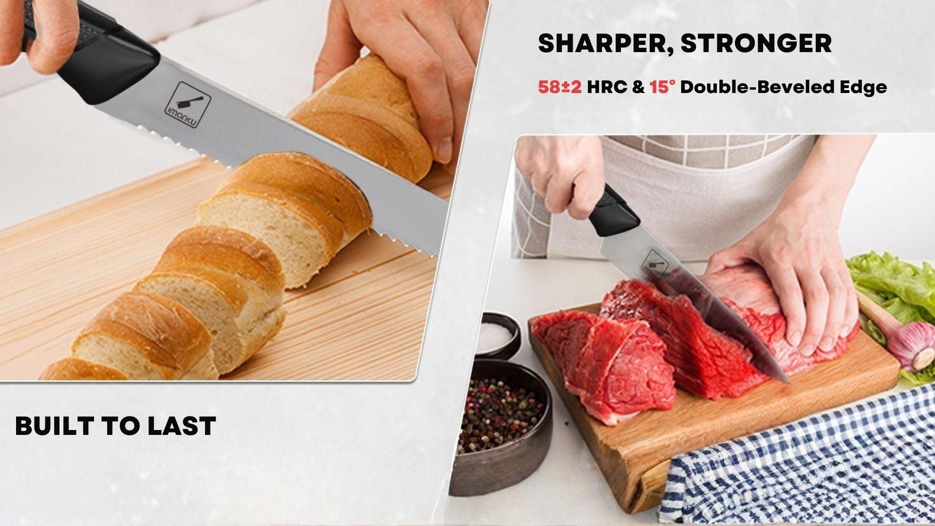 Crafted from German stainless steel, this premium sharp knife set features Rockwell hardness of 56±2 and a 15° double-beveled edge, delivering long-lasting sharpness, precise cuts, and reliable performance for everyday and professional cooking.
