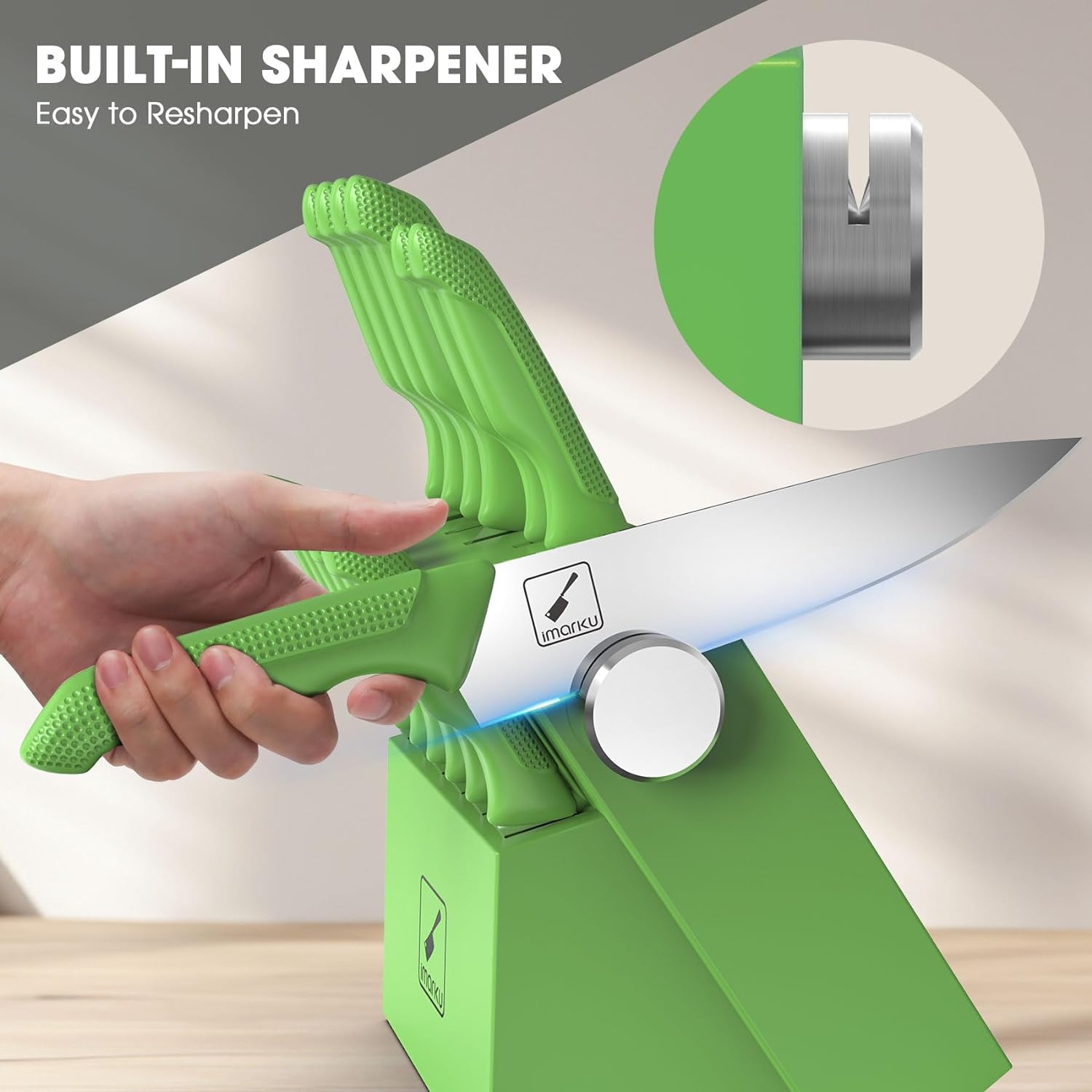 imarku's dishwasher-safe knife set and knife block are easy to clean and maintain. For best results, hand wash to preserve sharpness and prolong the lifespan of your knives. Enjoy quick and easy cleanup and storage after every use.