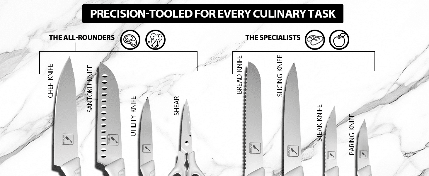 This set includes a variety of essential kitchen knives, such as chef's knife, bread knife, utility knife, paring knife, steak knives, and more.