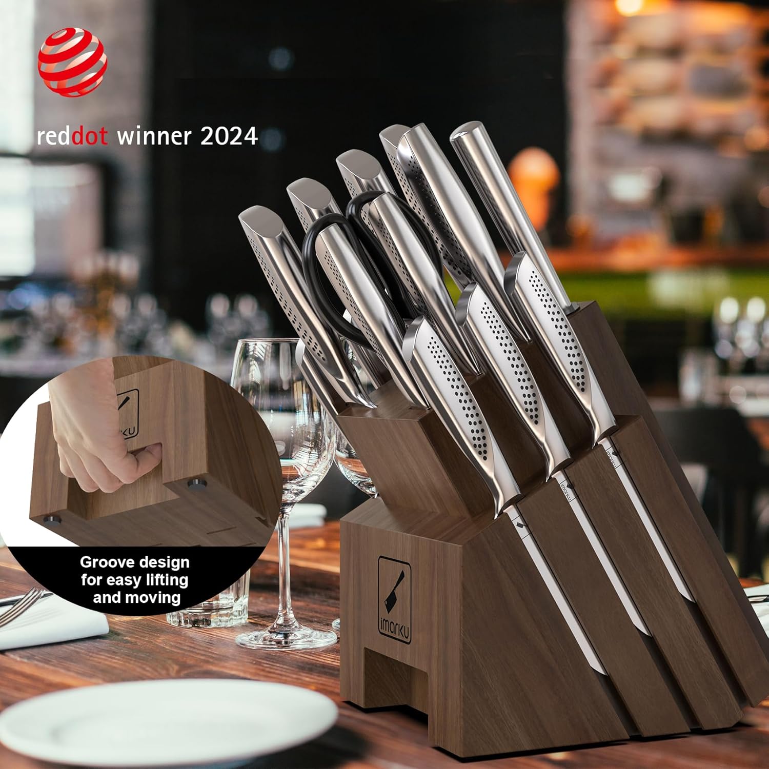 This knife set is a 2024 Red Dot Award winner, crafted from high-carbon stainless steel for exceptional sharpness and durability. The ergonomic non-slip handles and premium walnut base ensure comfort, stability, and style. Its full tang construction and dishwasher-safe design make it both functional and easy to maintain.